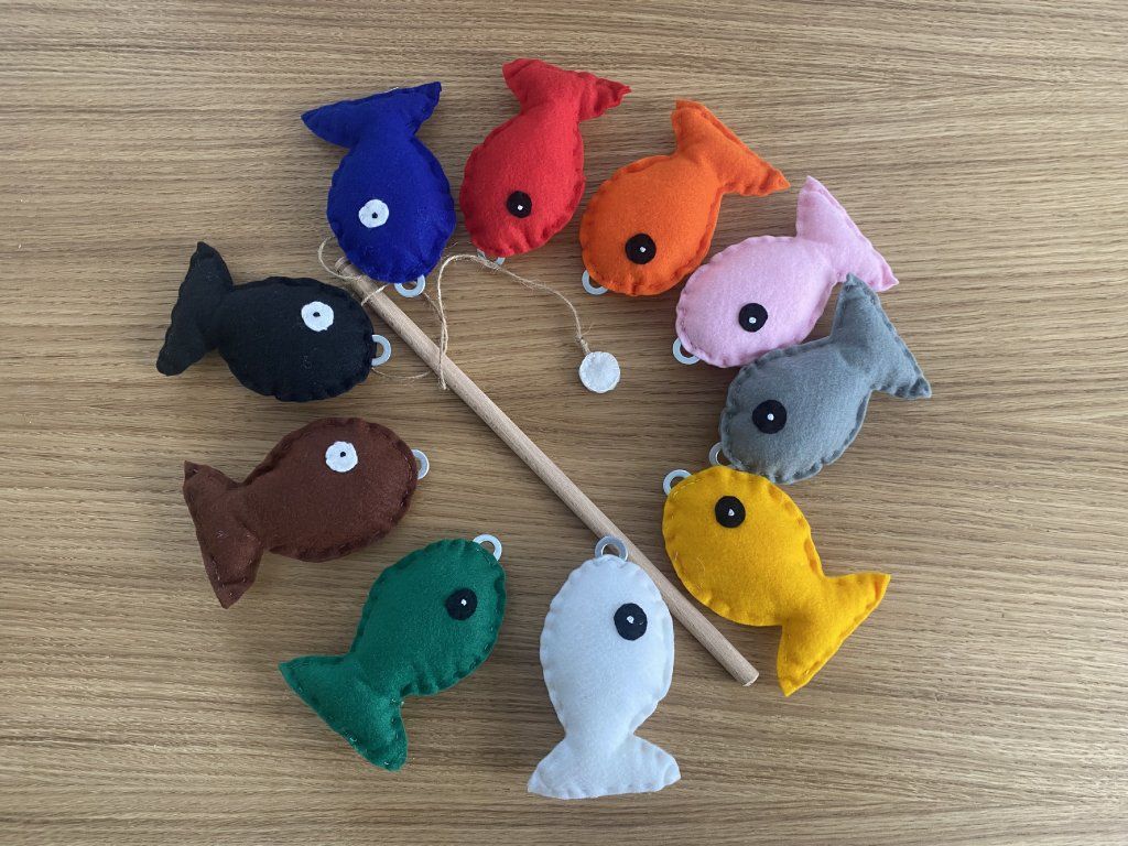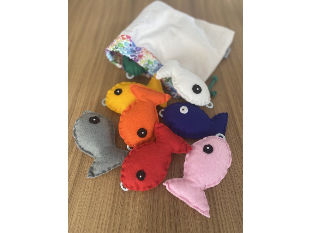 - 10 fleece fish (hand-sewn), each a different color