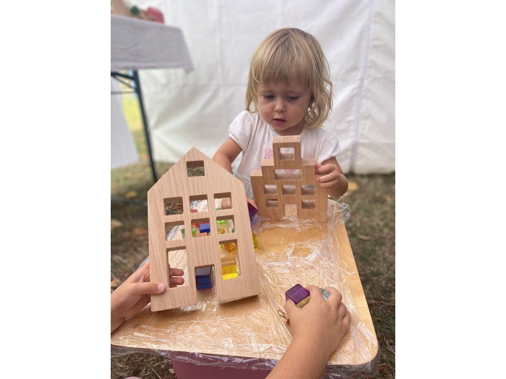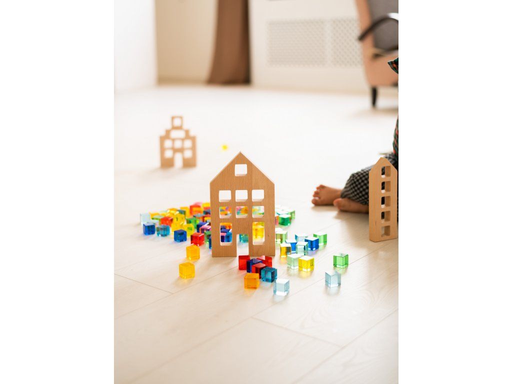 The window openings of each house are just large enough for children to insert cubes measuring 25x25 mm, which supports fine motor skills and coordination. In addition, thanks to the translucent crystal cubes, children can learn colors and color combinations in relation to the light transmission, which is an exceptional way to develop their creativity and attention to detail. All this in the sense of sensory play, which is a way of playing that supports children's senses, emotional development and cognitive growth.