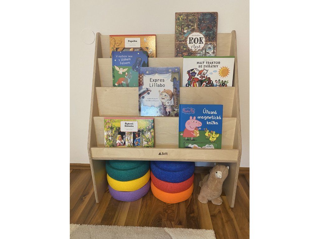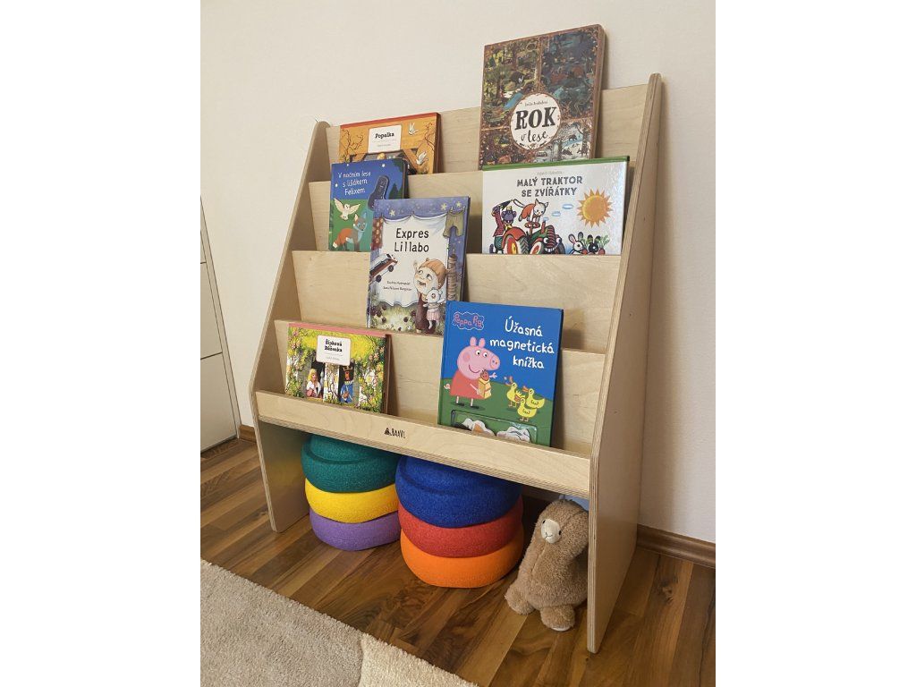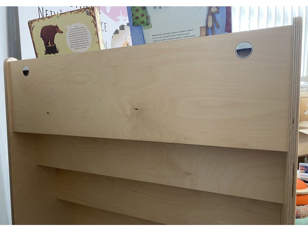 The bookcase allows individual books to be stored with the front of the book facing forward, not the classic spine. This way, children can choose books according to their appearance and reach for the one they like without needing the assistance of an adult.
